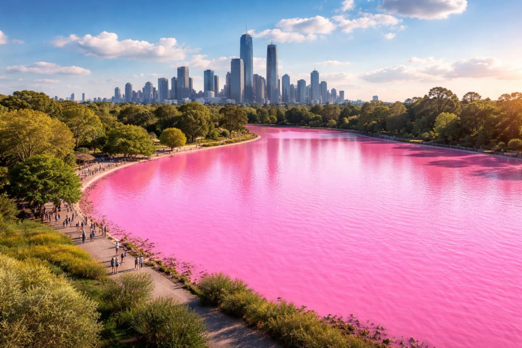 The lake, which typically reflects calm blue and green tones, began shifting hues over a matter of days. Soon, its waters appeared almost bubblegum pink under sunlight, creating a sharp contrast against the surrounding greenery and skyline. For many locals, it was a once-in-a-lifetime sight—both beautiful and puzzling.