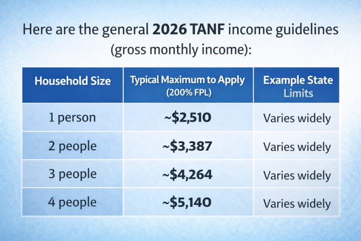 Here are the general 2026 TANF income guidelines (gross monthly income):
