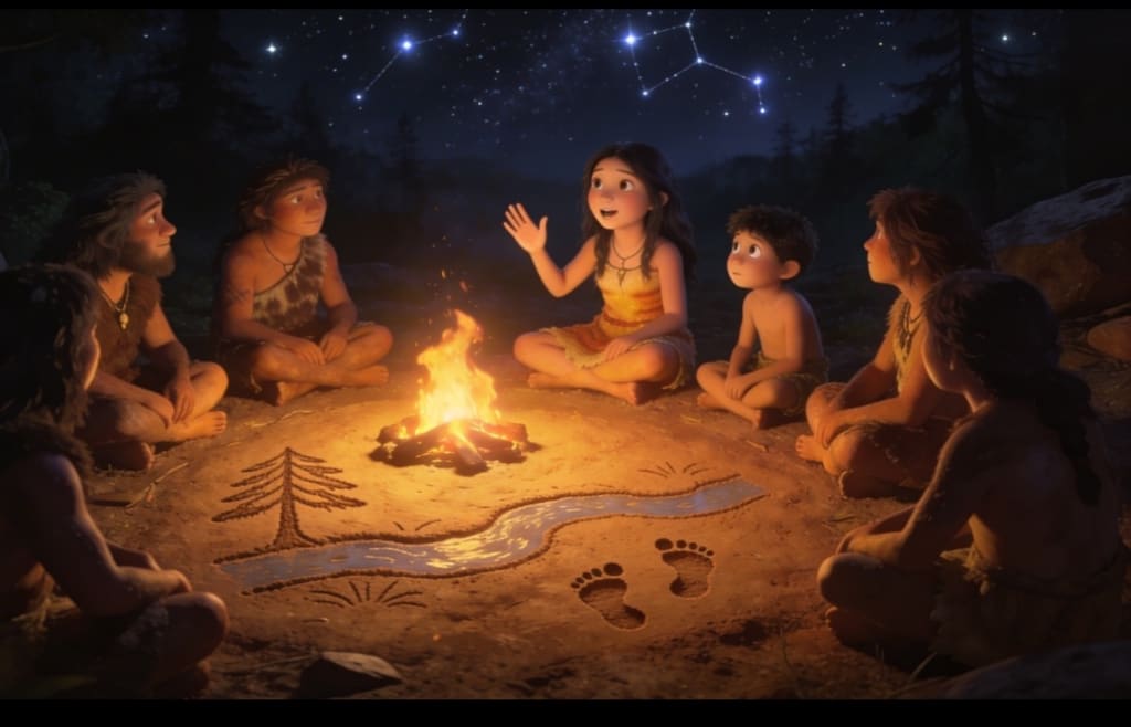 Soon, nights were no longer just for sleeping or fearing the dark. They became places where people met the past and rearranged it into meaning. Children learned not only where to find food, but why their people moved with the seasons, why they honoured certain animals, why they gathered under certain trees.