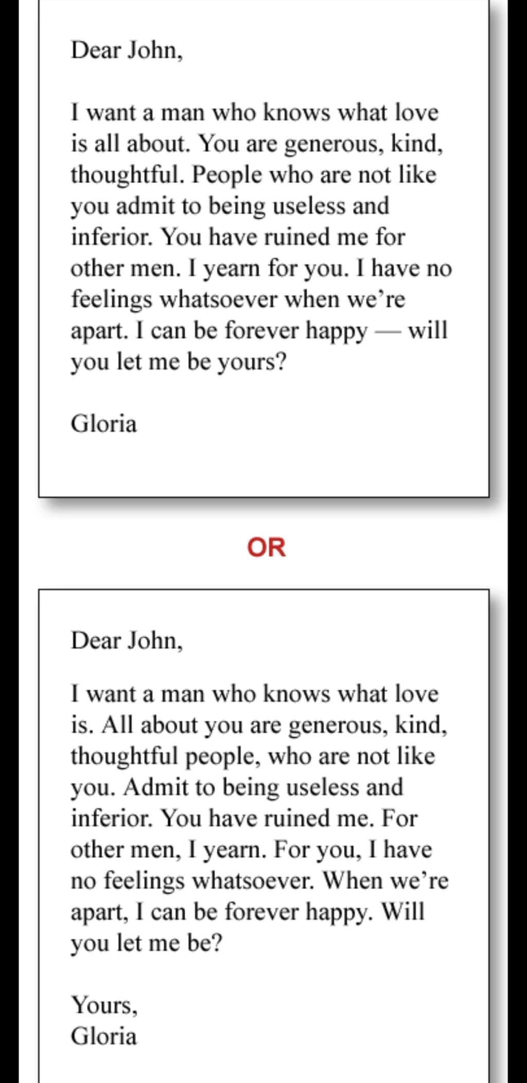 No, I don’t want anything from real life; you have to adhere to my premise, which is that you are in a relationship with your favorite literary character, and one of you wants to move on. Write a Dear John letter to or from your favorite literary character, totally up to you to decide who’s the dumper and who’s the dumpee. For extra special bonus, you may respond to any entry in addition to writing your own.