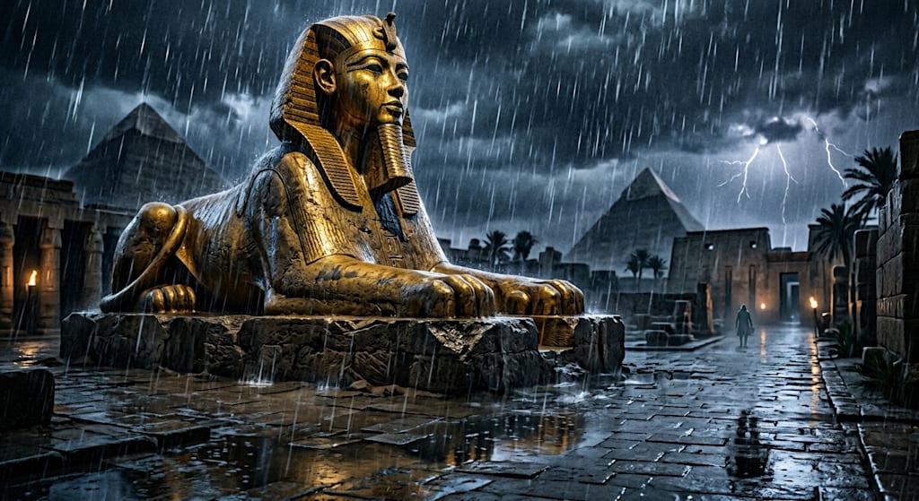 I crouched behind a throne of gold, massive as a monument, built for a king of giants or a god who had long since abandoned his seat. The air was thick and ancient. And ahead of us — wider than any building I had ever known, taller than the tree line — a golden sphinx sat in silence, watching everything and saying nothing.